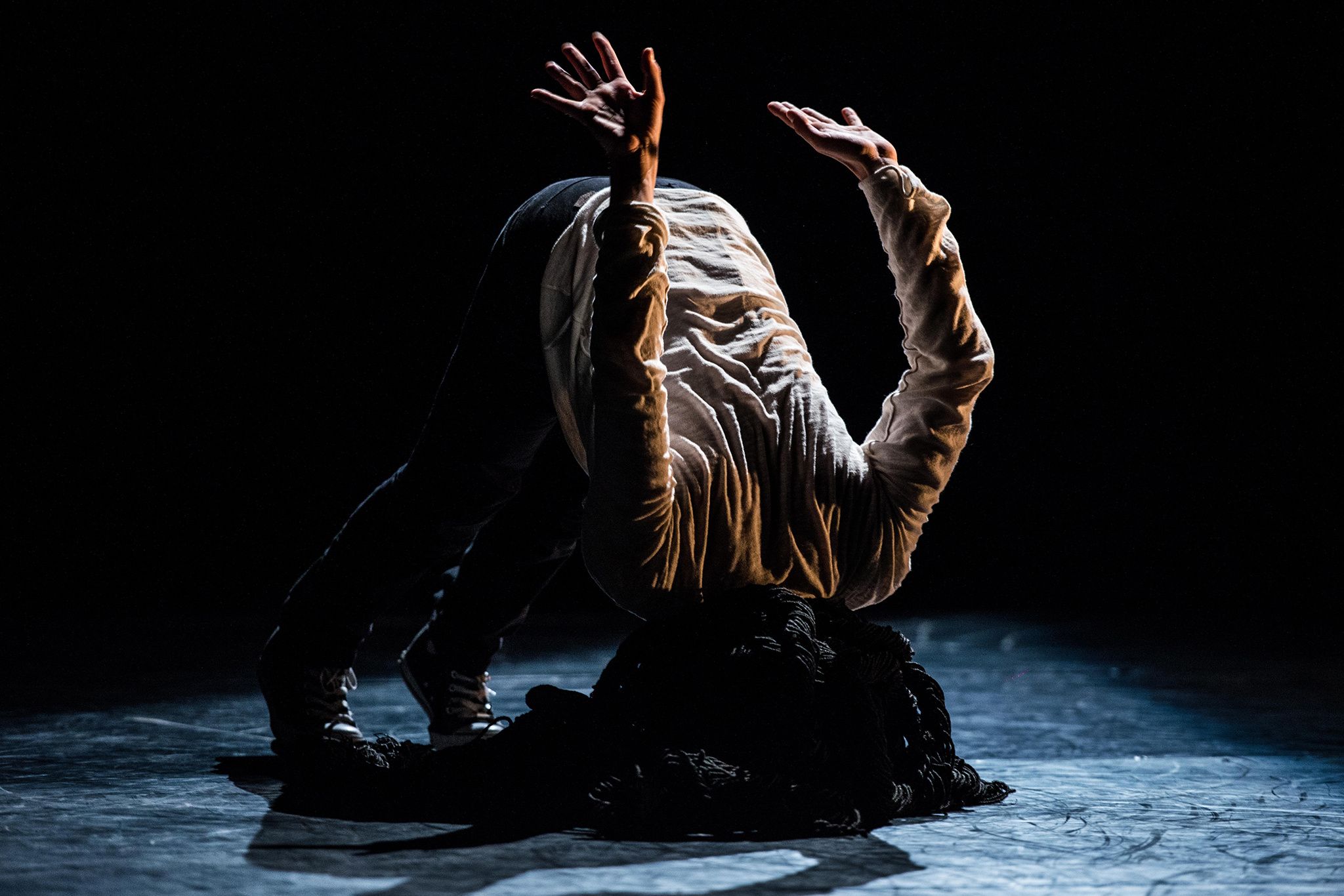 Un homme seul, sa chaîne stéréo et quelques vieux disques vinyles, le free-jazz d'Archie Sheep et Pharoah Sanders, revisite le blues des origines. Est-on dans une chambre d'ado, dans un studio de danse, au purgatoire...? Un peu tout ça sans doute. Il y a une corde aussi, pour se pendre ? Non plutôt pour grimper, serpenter, s’élever, danser... Une identité qui s'invente au gré de ses métamorphoses. On entend mieux la musique en regardant ce corps qui danse sur le fil.